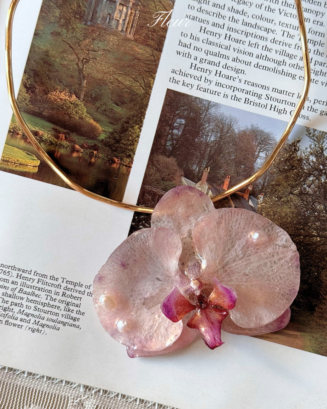 A minimalist luxury orchid necklace featuring a translucent handcrafted orchid on a sleek gold collar. Designed as a statement floral jewelry piece with soft elegance and modern femininity.