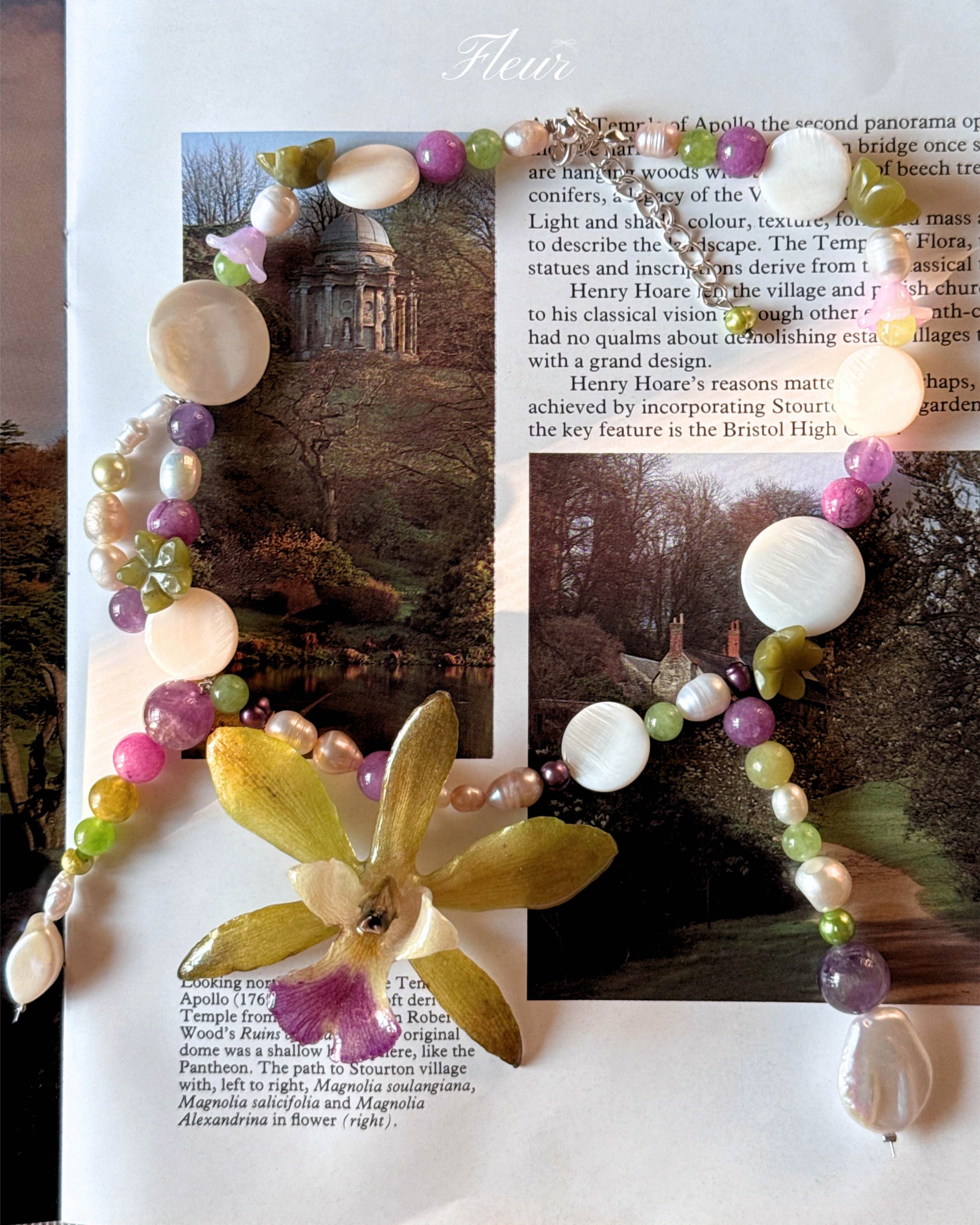 A handcrafted lime green orchid statement necklace accented with freshwater pearls and pastel gemstone beads. Fresh, romantic, and garden-inspired perfect for summer styling, bridal looks, and lovers of floral artisan jewelry.