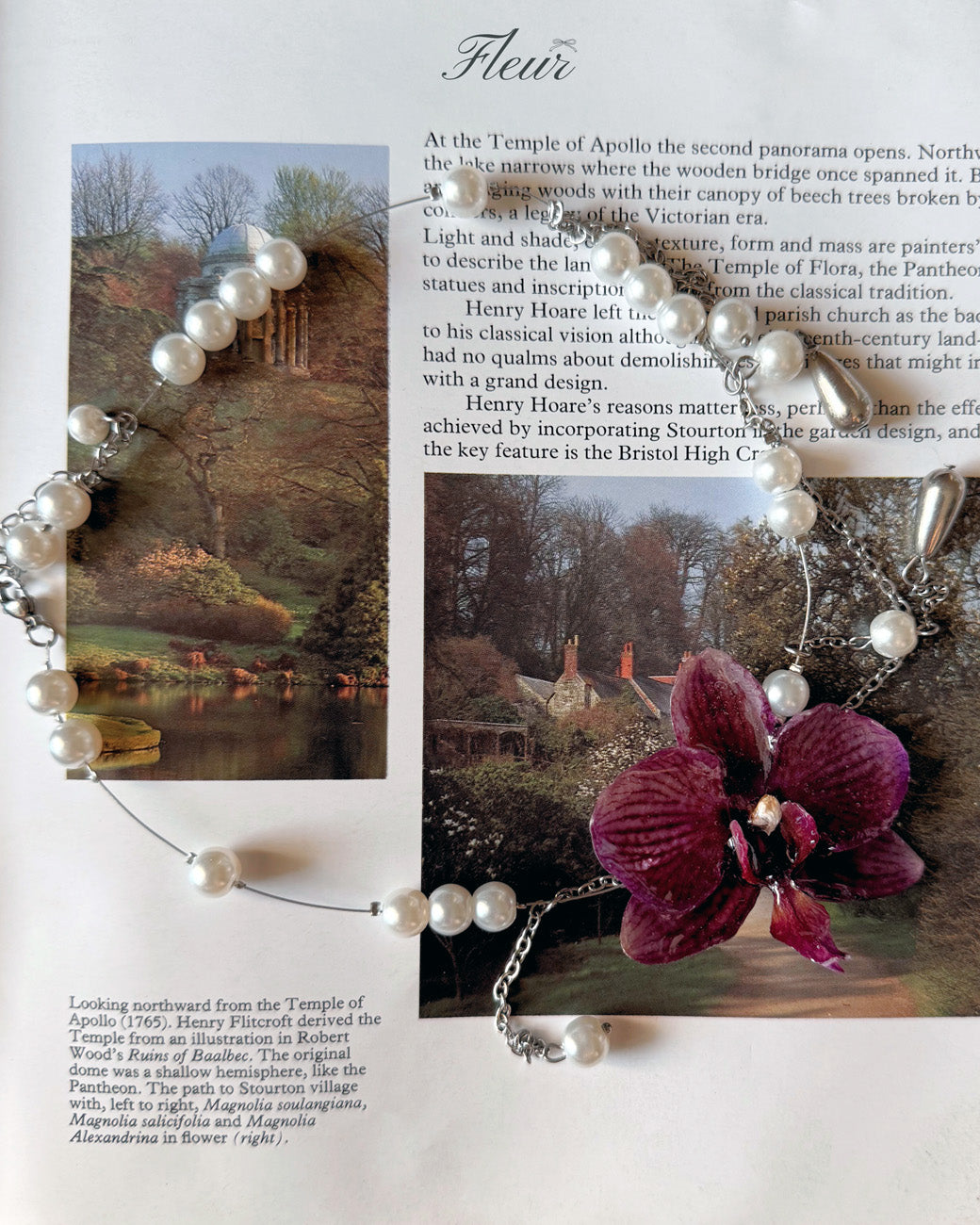 A modern luxury orchid necklace featuring a handcrafted orchid bloom, natural pearls, and fluid silver drips. Designed as wearable art, Orchid Drip reflects elegant movement, soft femininity, and refined contemporary style.