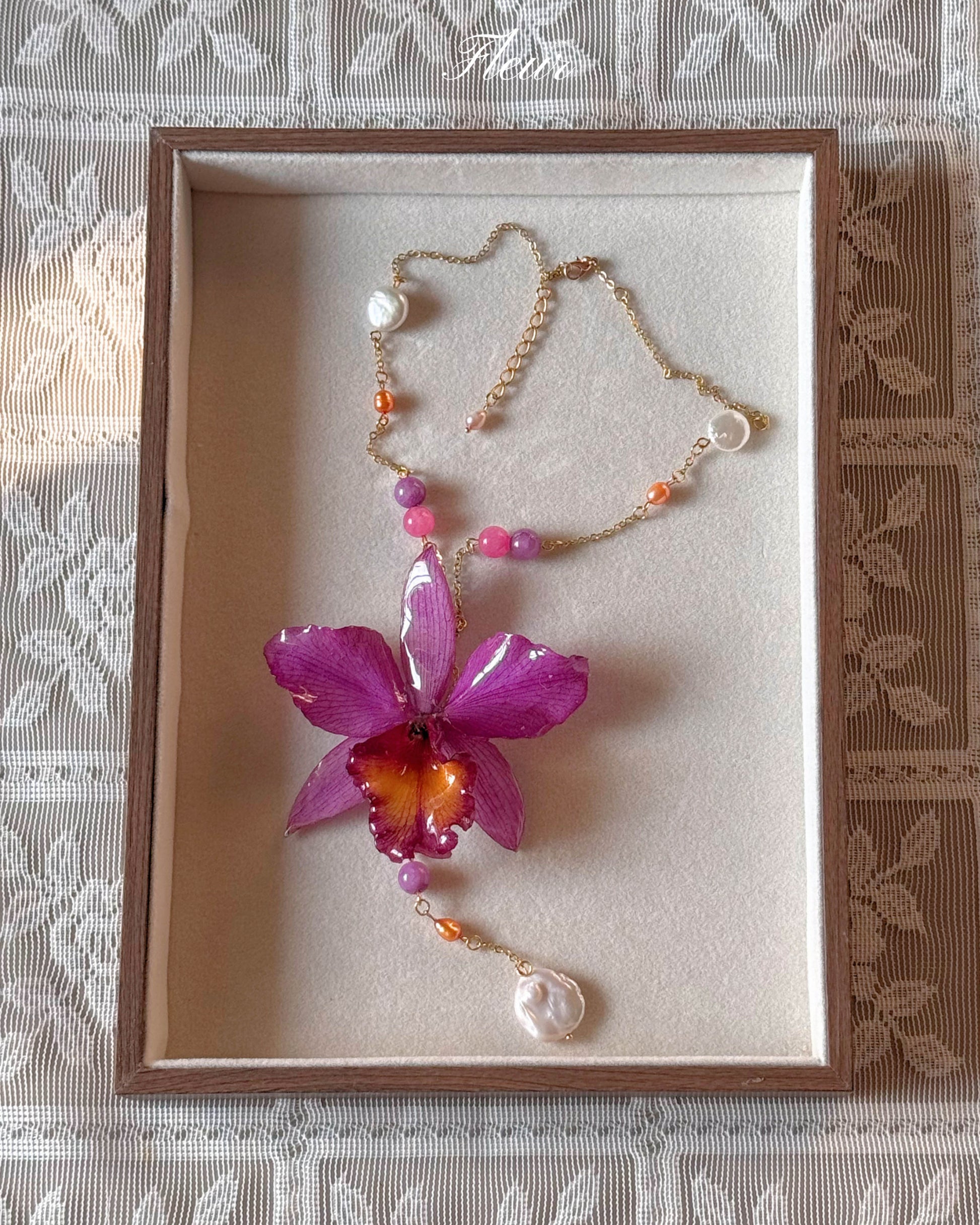 A handcrafted pink orchid statement necklace featuring warm sunset tones, freshwater pearls, and delicate gold chain details. Bold yet romantic β perfect for summer styling, bridal accents, and lovers of artistic floral jewelry.
